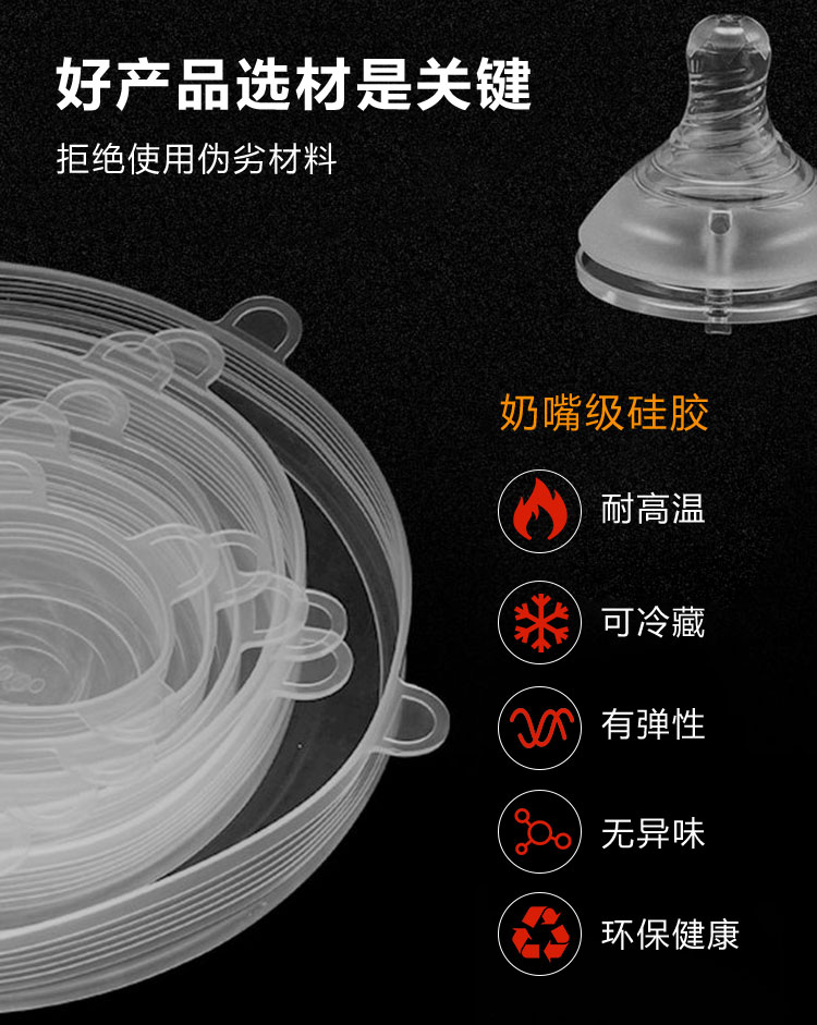 產(chǎn)品特點:適用于冰箱冷凍可做保鮮冷藏使用,可進洗碗機消毒柜,也可進烤箱、微波爐加熱制作食物。能使鍋碗密封,用于食品保鮮。配合不同大小鍋、碗、盆以及杯子等器皿使用。產(chǎn)品方便清洗,手感柔軟,顏色鮮艷,經(jīng)久耐用,環(huán)保健康。